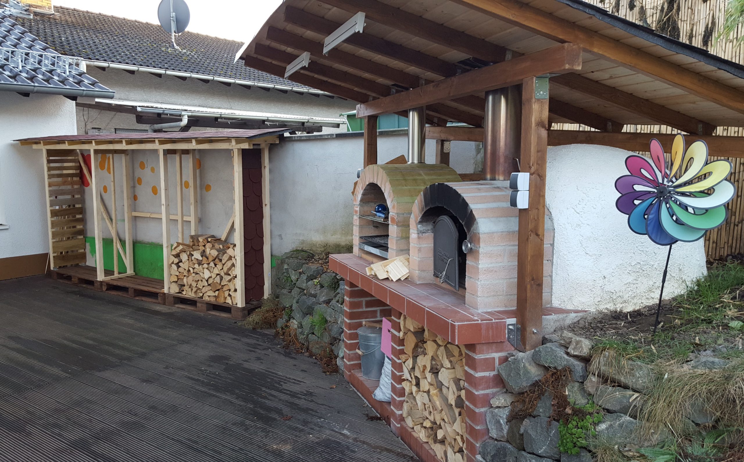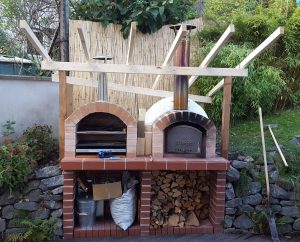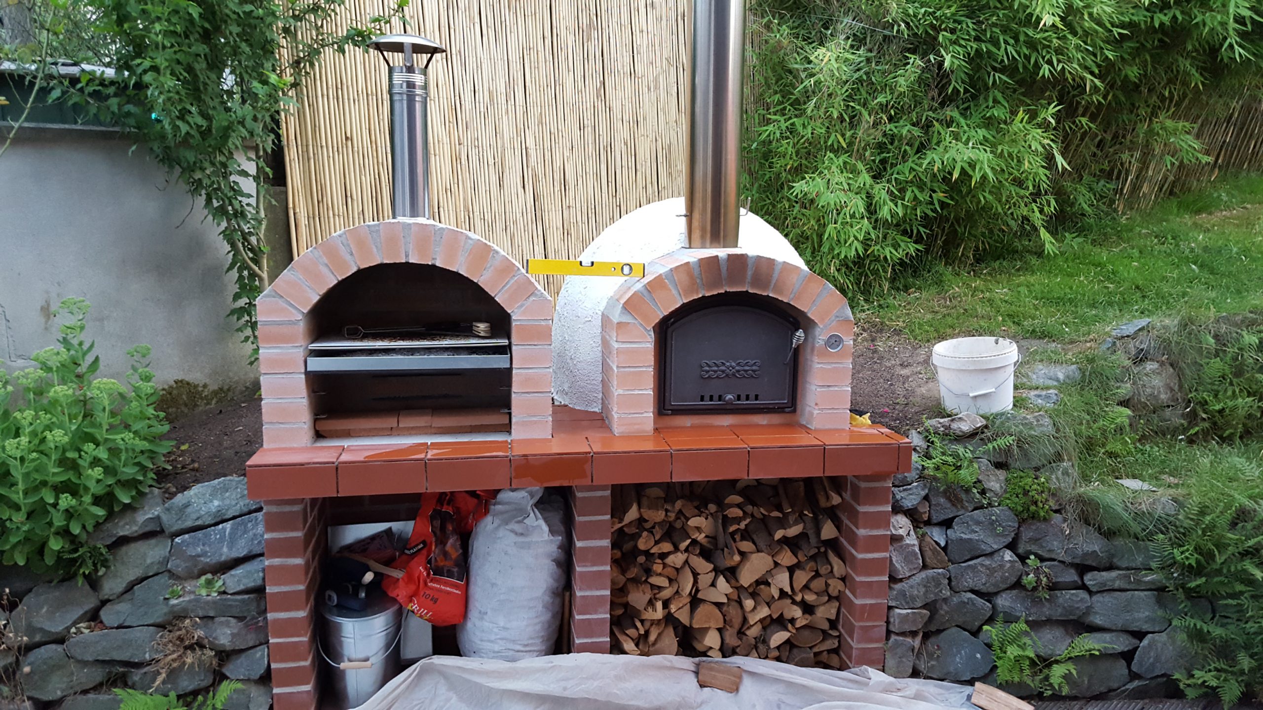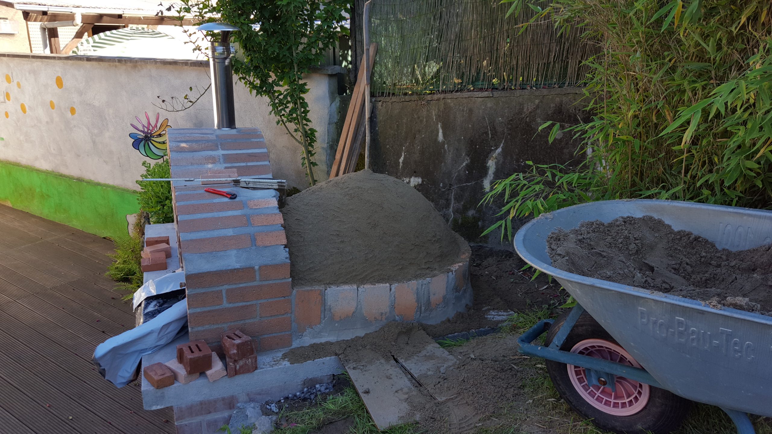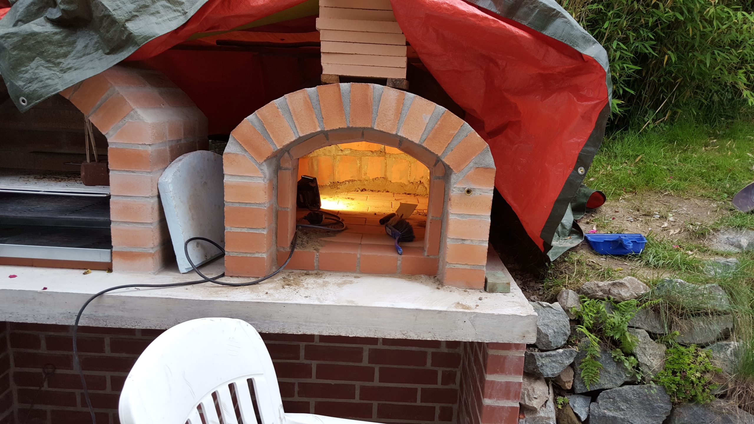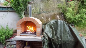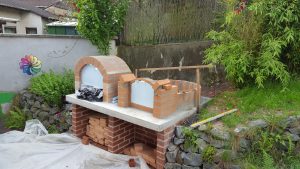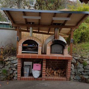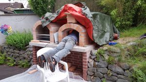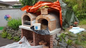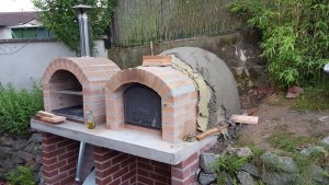 Ansonsten kamen die üblichen Sachen zum Einsatz: Beton für die Bodenplatte und die Platte des ersten Stocks zusammen mit entsprechend eingebrachter Bewährung. Die Klinkersteine wurden mit Zementmörtel gemauert. Für den Grill und den Ofen wurden Schamottesteine verwendet, vermauert mit Schamottemörtel alias Feuerzement. Der Backofenboden liegt auf Quarzsand, damit die Hitze nicht direkt in den Beton durchstrahlt. Außen gab es eine Abschlußsschicht auf die ca. 10cm dicke Schamottekuppel, bestehend aus Steinwolle, Kaninchendraht als Bewährung, Zementabschluss und dehnungsfähigem Silikonaußenputz. Die Ofenrohre, verstellbare Reduzierklappe, Tür, Einbauthermometer, Grillroste, Pizzableche sowie sonstige Ofenwerkzeuge (Kratzer, Schieber, Hudelwisch, Temperaturmesser) gibt´s in den einschlägigen Internetshops, das Baumaterial beim Baustoffhändler des Vertrauens. Es erforderte einige Telefonate, bis klar war, wo man Schamottesteine und Feuerzement in der Nähe direkt kaufen kann, so dass man es nicht per Lieferung bringen lassen muss. Anhand der Größe der Steine und der Planung der Verfugung bzw. des Auslegens wurde die Bodenplatte und die Zwischendecke dimensioniert. Die Steine wurden bis auf einen kleinen Rest alle verbaut, ebenso ging die berechnete Menge Beton, Mörtel und Zement sehr gut auf. Für den Winter ist noch eine Überdachung geplant, das hat aber noch etwas Zeit.