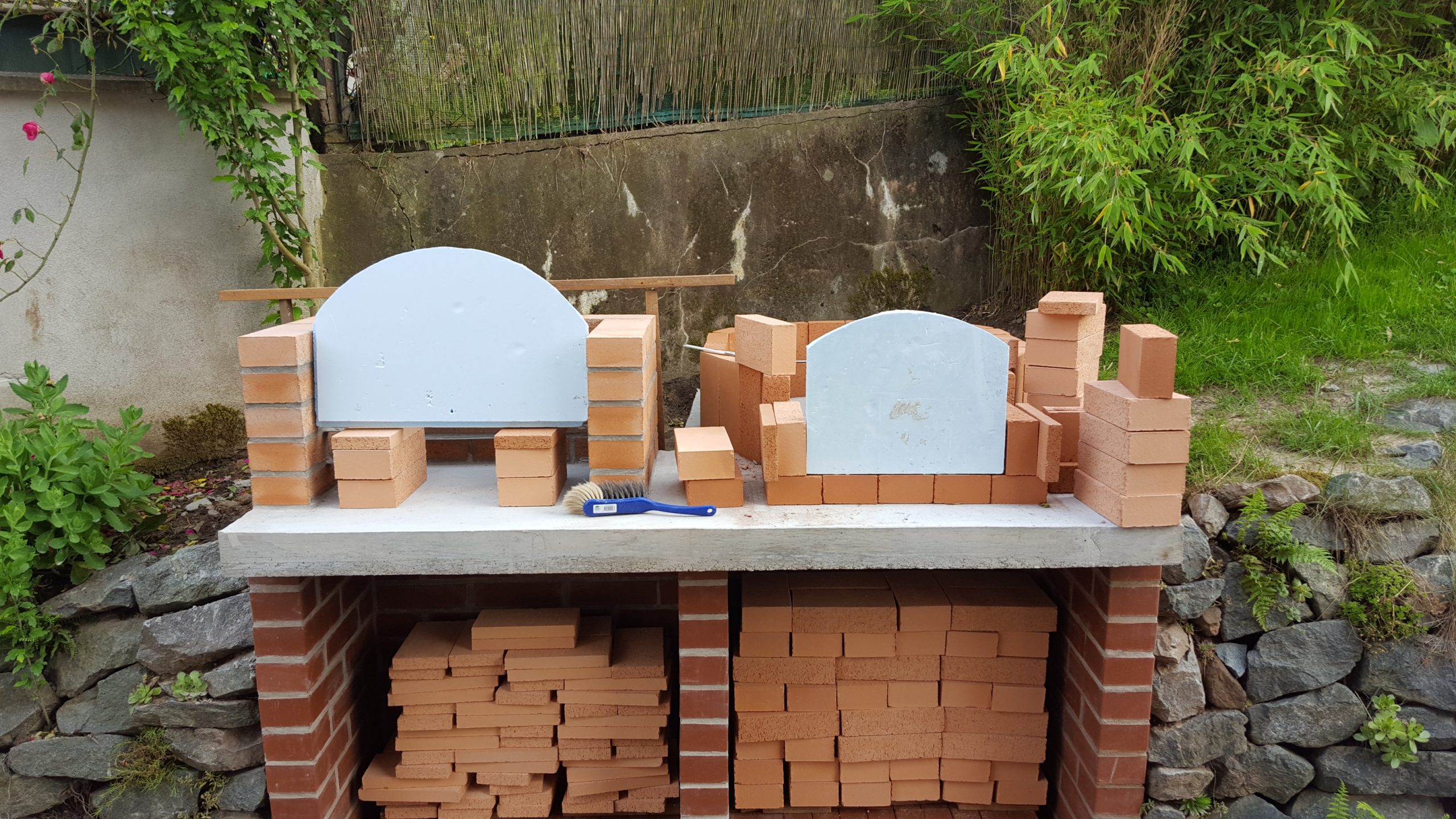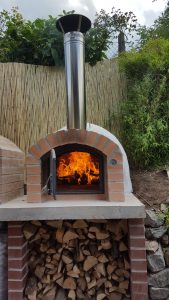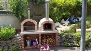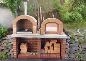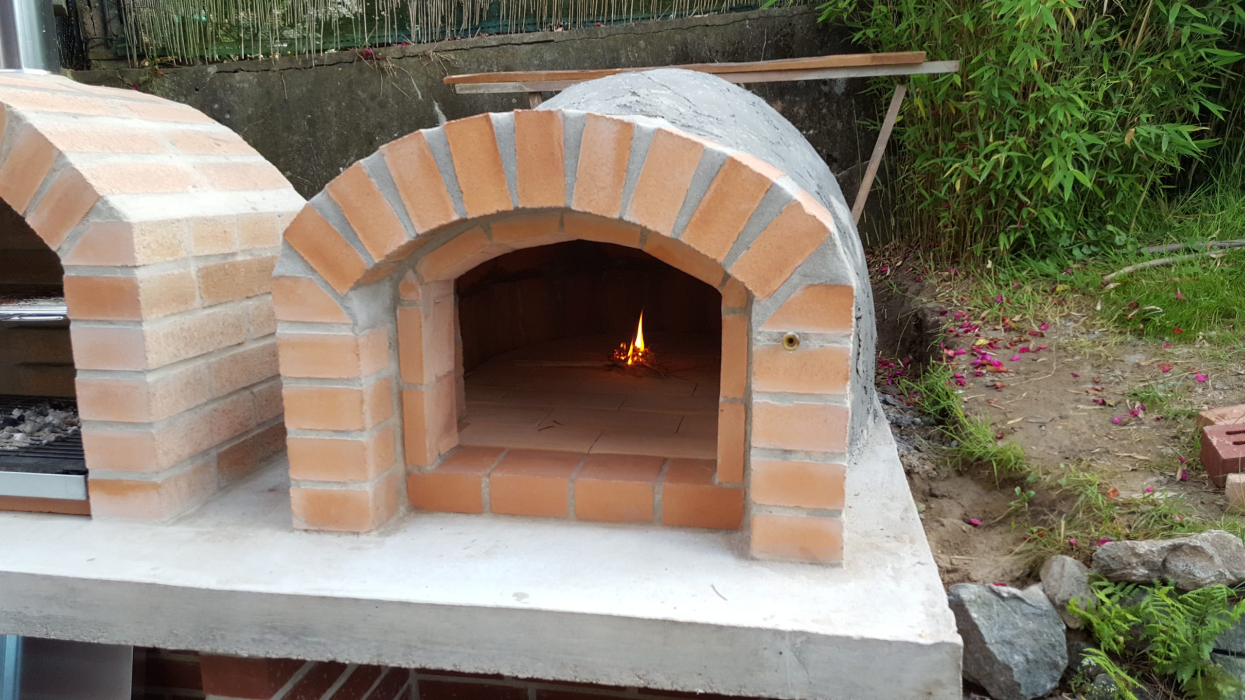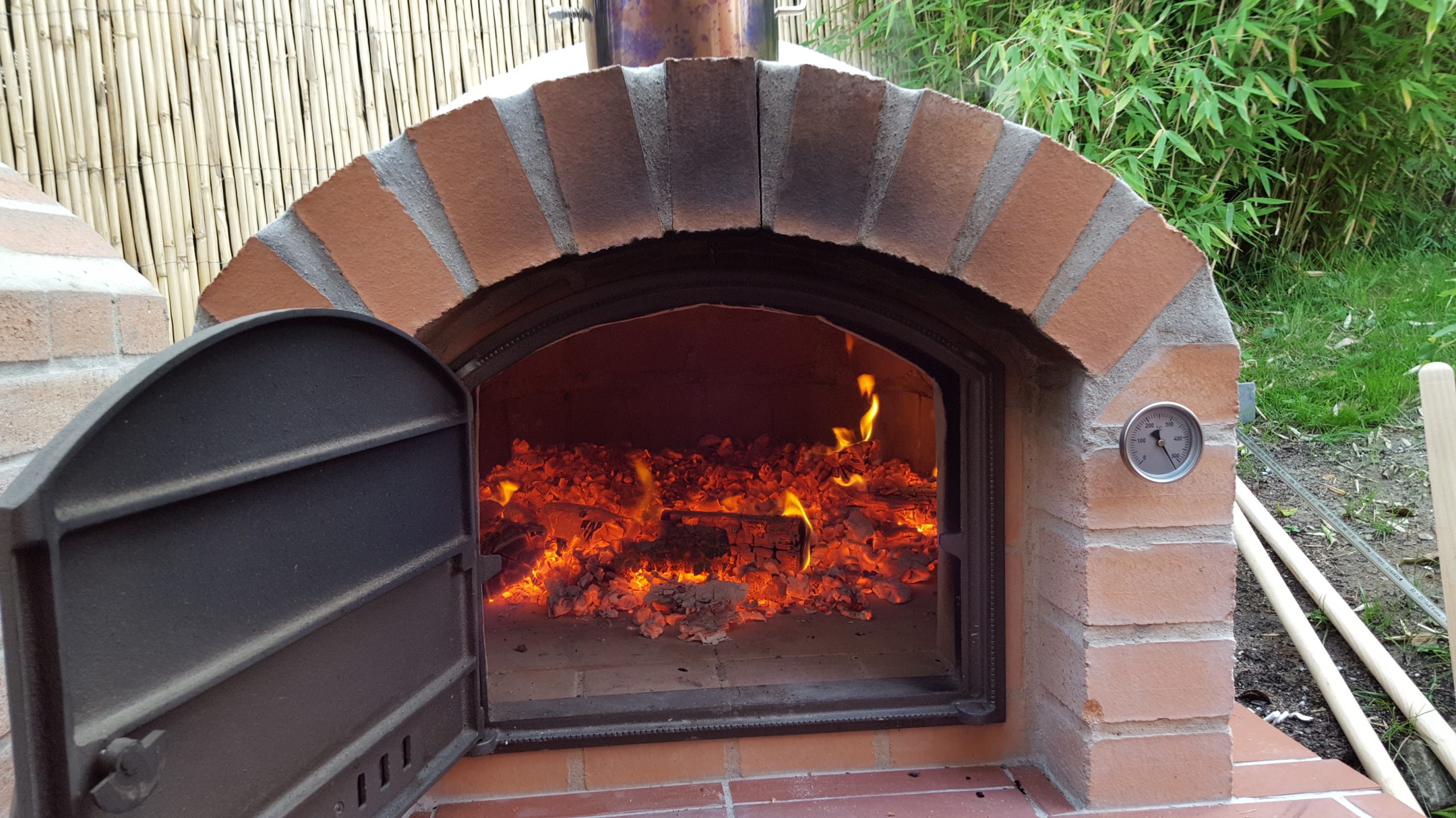 Ansonsten kamen die üblichen Sachen zum Einsatz: Beton für die Bodenplatte und die Platte des ersten Stocks zusammen mit entsprechend eingebrachter Bewährung. Die Klinkersteine wurden mit Zementmörtel gemauert. Für den Grill und den Ofen wurden Schamottesteine verwendet, vermauert mit Schamottemörtel alias Feuerzement. Der Backofenboden liegt auf Quarzsand, damit die Hitze nicht direkt in den Beton durchstrahlt. Außen gab es eine Abschlußsschicht auf die ca. 10cm dicke Schamottekuppel, bestehend aus Steinwolle, Kaninchendraht als Bewährung, Zementabschluss und dehnungsfähigem Silikonaußenputz. Die Ofenrohre, verstellbare Reduzierklappe, Tür, Einbauthermometer, Grillroste, Pizzableche sowie sonstige Ofenwerkzeuge (Kratzer, Schieber, Hudelwisch, Temperaturmesser) gibt´s in den einschlägigen Internetshops, das Baumaterial beim Baustoffhändler des Vertrauens. Es erforderte einige Telefonate, bis klar war, wo man Schamottesteine und Feuerzement in der Nähe direkt kaufen kann, so dass man es nicht per Lieferung bringen lassen muss. Anhand der Größe der Steine und der Planung der Verfugung bzw. des Auslegens wurde die Bodenplatte und die Zwischendecke dimensioniert. Die Steine wurden bis auf einen kleinen Rest alle verbaut, ebenso ging die berechnete Menge Beton, Mörtel und Zement sehr gut auf. Für den Winter ist noch eine Überdachung geplant, das hat aber noch etwas Zeit.