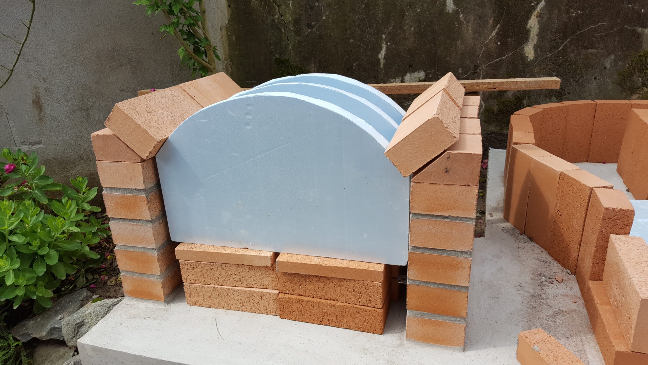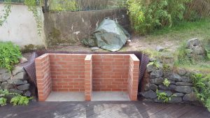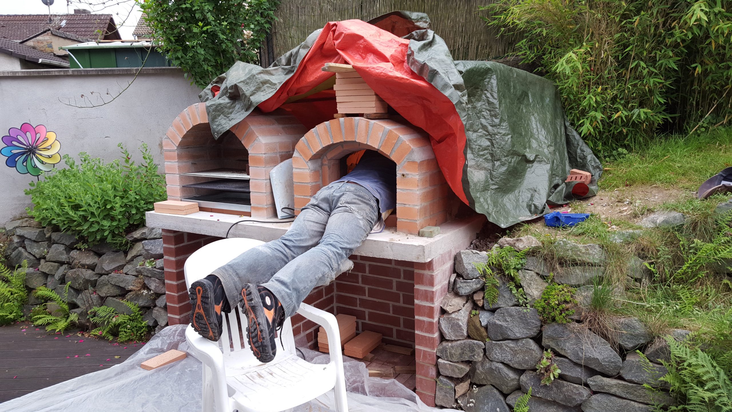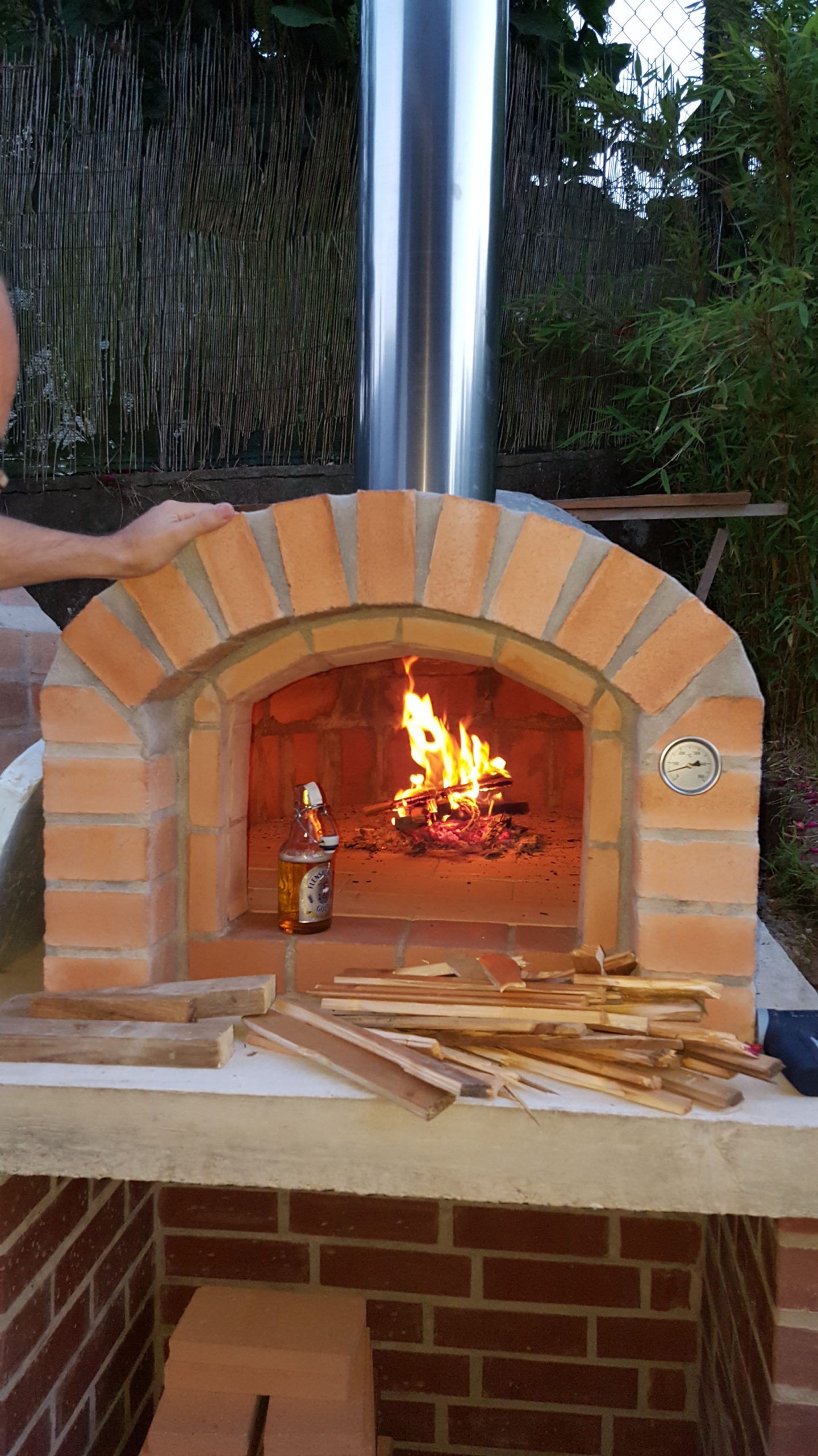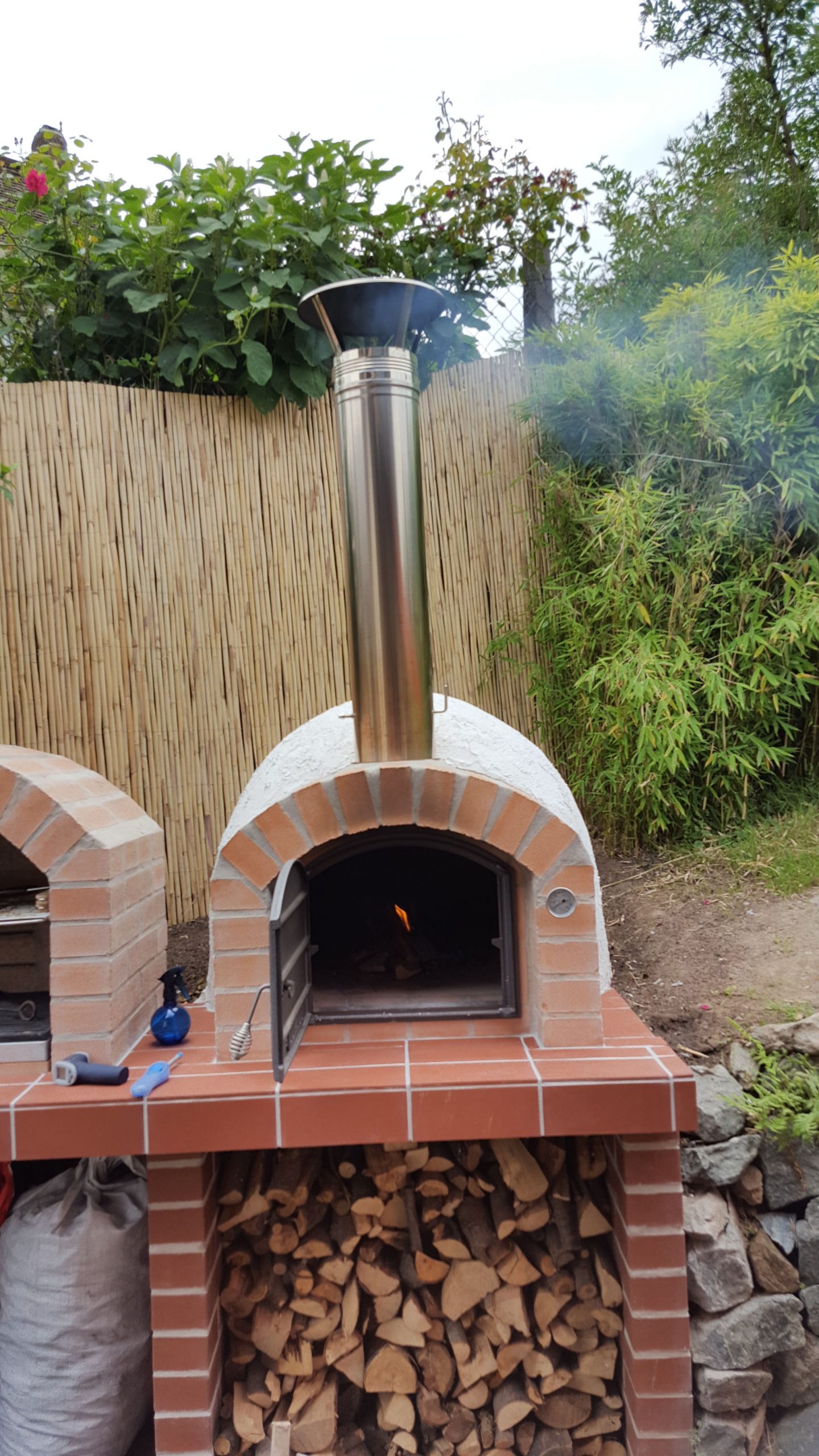 Ansonsten kamen die üblichen Sachen zum Einsatz: Beton für die Bodenplatte und die Platte des ersten Stocks zusammen mit entsprechend eingebrachter Bewährung. Die Klinkersteine wurden mit Zementmörtel gemauert. Für den Grill und den Ofen wurden Schamottesteine verwendet, vermauert mit Schamottemörtel alias Feuerzement. Der Backofenboden liegt auf Quarzsand, damit die Hitze nicht direkt in den Beton durchstrahlt. Außen gab es eine Abschlußsschicht auf die ca. 10cm dicke Schamottekuppel, bestehend aus Steinwolle, Kaninchendraht als Bewährung, Zementabschluss und dehnungsfähigem Silikonaußenputz. Die Ofenrohre, verstellbare Reduzierklappe, Tür, Einbauthermometer, Grillroste, Pizzableche sowie sonstige Ofenwerkzeuge (Kratzer, Schieber, Hudelwisch, Temperaturmesser) gibt´s in den einschlägigen Internetshops, das Baumaterial beim Baustoffhändler des Vertrauens. Es erforderte einige Telefonate, bis klar war, wo man Schamottesteine und Feuerzement in der Nähe direkt kaufen kann, so dass man es nicht per Lieferung bringen lassen muss. Anhand der Größe der Steine und der Planung der Verfugung bzw. des Auslegens wurde die Bodenplatte und die Zwischendecke dimensioniert. Die Steine wurden bis auf einen kleinen Rest alle verbaut, ebenso ging die berechnete Menge Beton, Mörtel und Zement sehr gut auf. Für den Winter ist noch eine Überdachung geplant, das hat aber noch etwas Zeit.