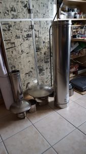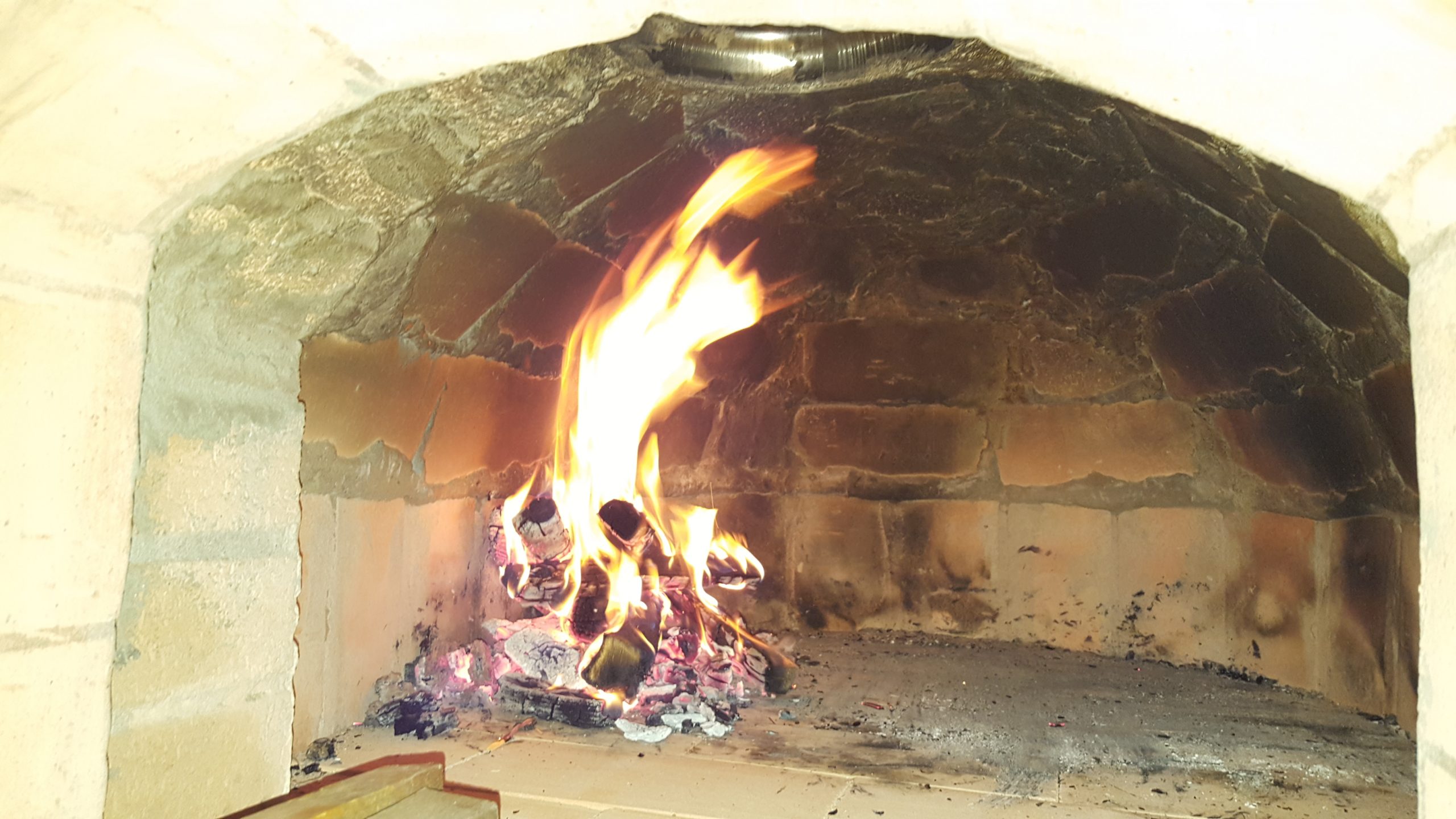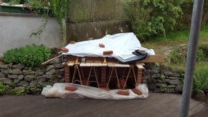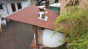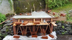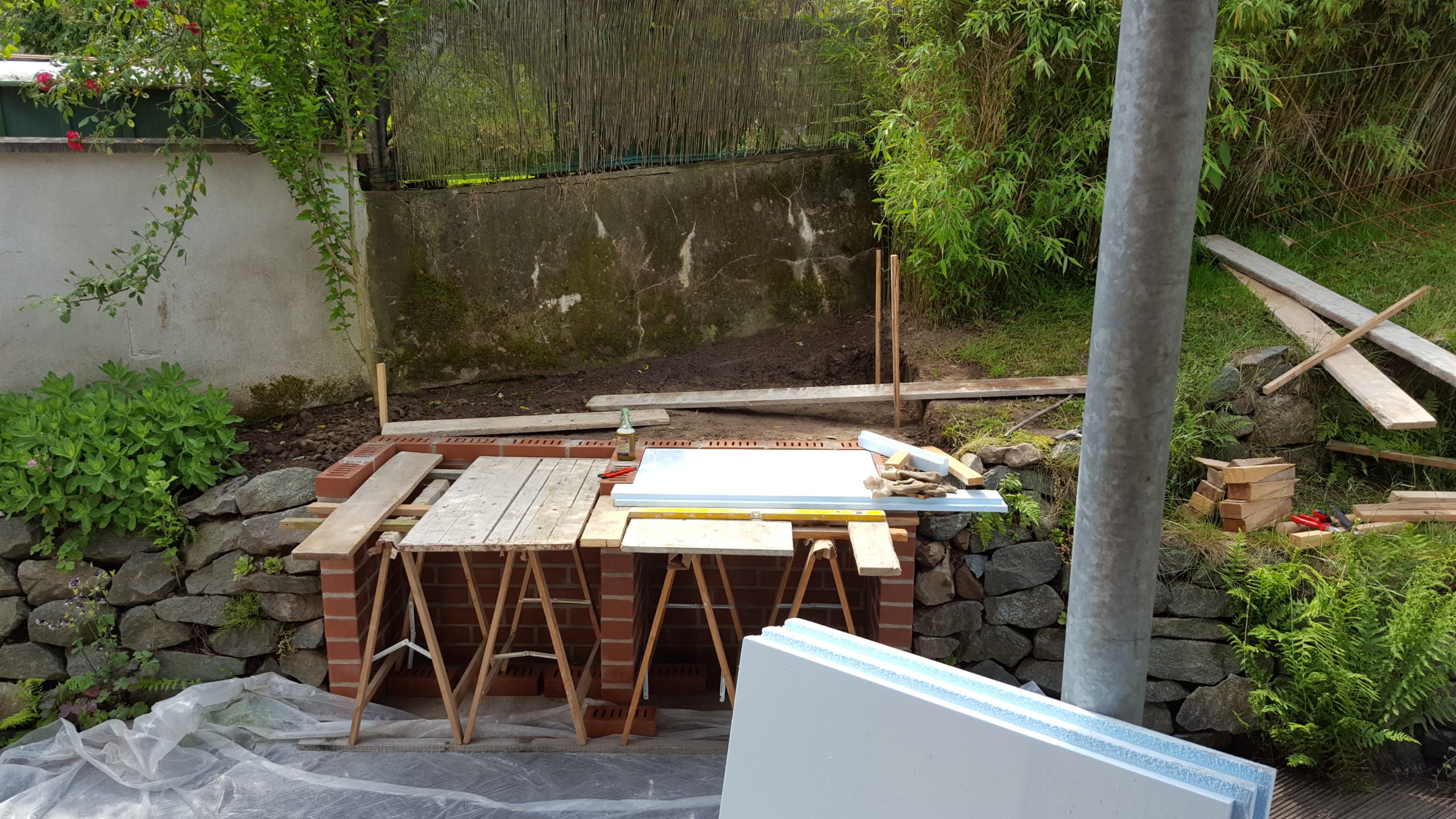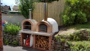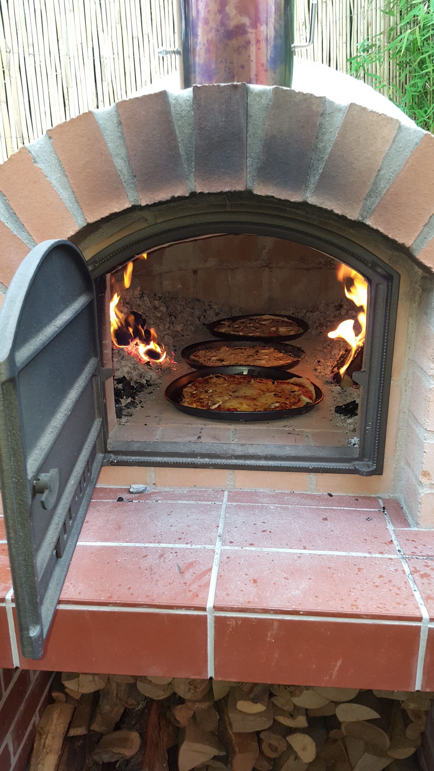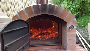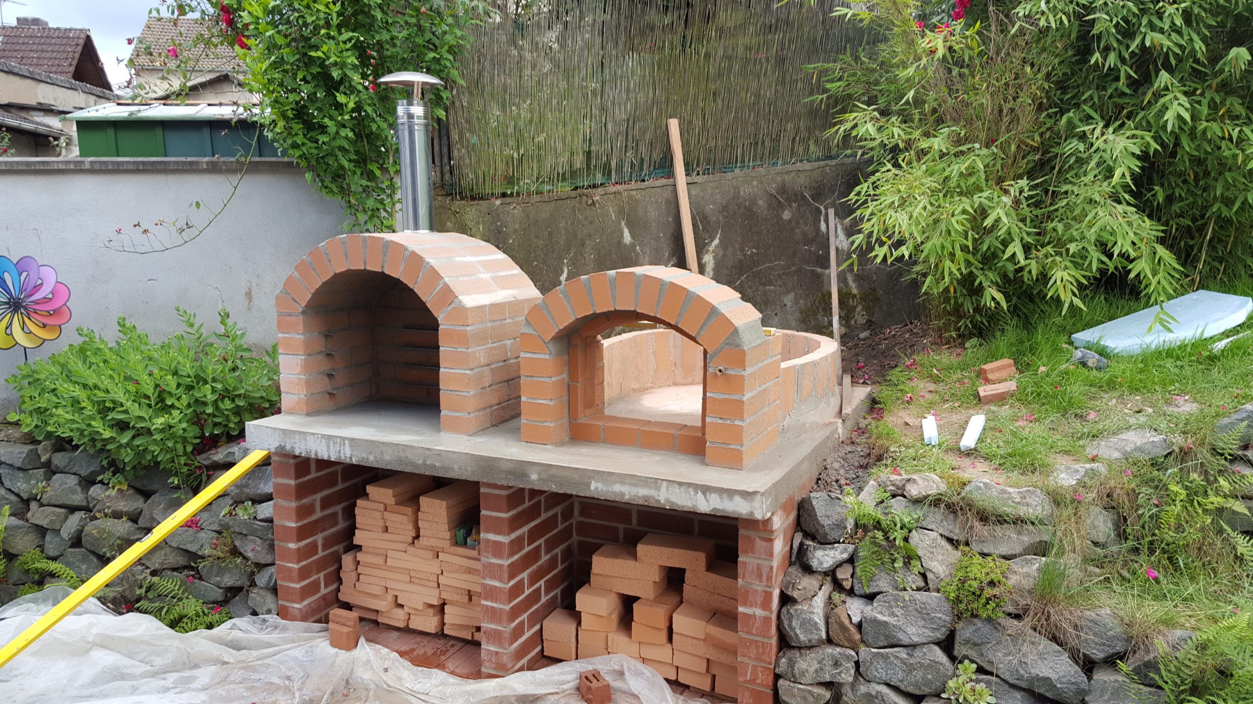 Ansonsten kamen die üblichen Sachen zum Einsatz: Beton für die Bodenplatte und die Platte des ersten Stocks zusammen mit entsprechend eingebrachter Bewährung. Die Klinkersteine wurden mit Zementmörtel gemauert. Für den Grill und den Ofen wurden Schamottesteine verwendet, vermauert mit Schamottemörtel alias Feuerzement. Der Backofenboden liegt auf Quarzsand, damit die Hitze nicht direkt in den Beton durchstrahlt. Außen gab es eine Abschlußsschicht auf die ca. 10cm dicke Schamottekuppel, bestehend aus Steinwolle, Kaninchendraht als Bewährung, Zementabschluss und dehnungsfähigem Silikonaußenputz. Die Ofenrohre, verstellbare Reduzierklappe, Tür, Einbauthermometer, Grillroste, Pizzableche sowie sonstige Ofenwerkzeuge (Kratzer, Schieber, Hudelwisch, Temperaturmesser) gibt´s in den einschlägigen Internetshops, das Baumaterial beim Baustoffhändler des Vertrauens. Es erforderte einige Telefonate, bis klar war, wo man Schamottesteine und Feuerzement in der Nähe direkt kaufen kann, so dass man es nicht per Lieferung bringen lassen muss. Anhand der Größe der Steine und der Planung der Verfugung bzw. des Auslegens wurde die Bodenplatte und die Zwischendecke dimensioniert. Die Steine wurden bis auf einen kleinen Rest alle verbaut, ebenso ging die berechnete Menge Beton, Mörtel und Zement sehr gut auf. Für den Winter ist noch eine Überdachung geplant, das hat aber noch etwas Zeit.